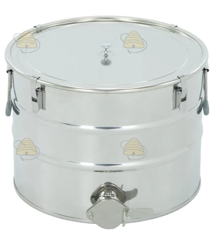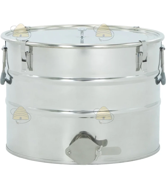 Dieser Abfüllkübel besteht aus lebensmittelechtem, hochwertigem Edelstahl und eignet sich für 30 Liter / 40 Kilo Honig. Es dient dank des 6/4" Edelstahl-Auslaufhahns / Quetschhahn an der Unterseite direkt auch als Abfüllbehälter.