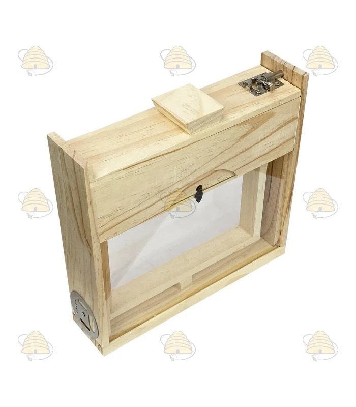Ein Begattungskästchen im Maß 1/3 Deutsch-Normal (ca. 24 cm × 24 cm × 6 cm). Es ist ausgestattet mit einem Futterbehälter, zwei Rähmchen sowie einer Scheibenöffnung, bei der ein Ausgang als Königinnenabsperrgitter dient.