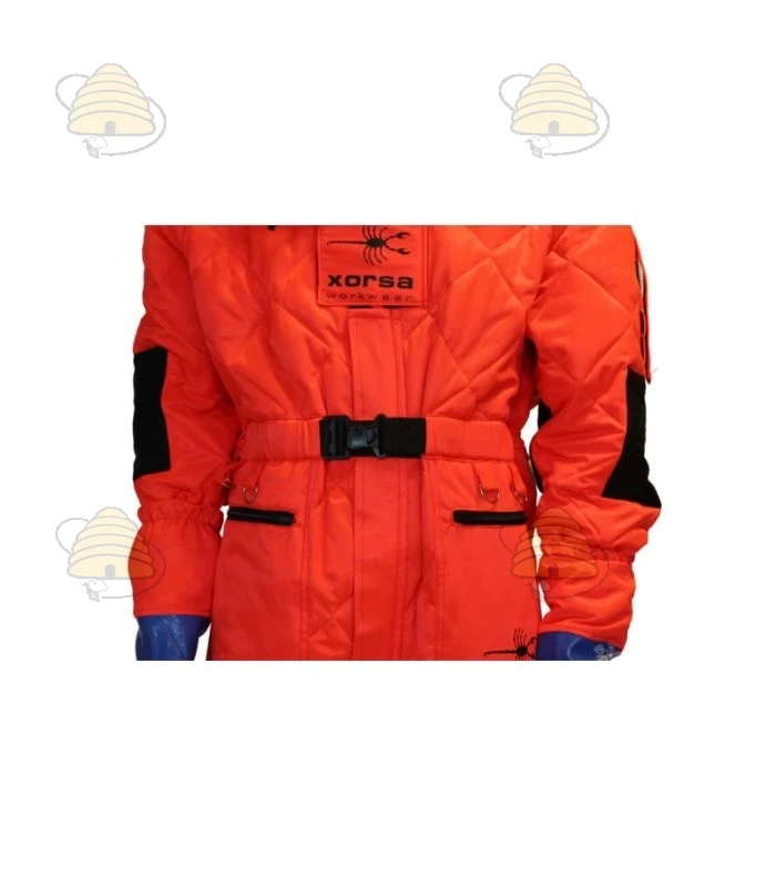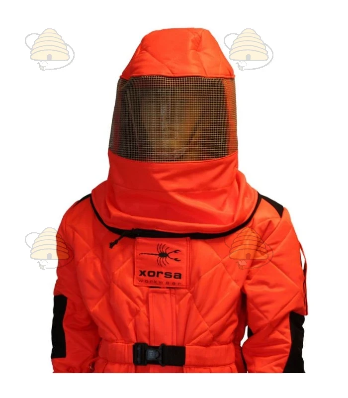 Komplettschutzanzug / Overall in beigefarbener Ausführung, der Ihnen optimalen Schutz vor der Asiatischen Hornisse bietet. Der Anzug ist mit Reißverschlusstaschen ausgestattet und besteht aus einem robusten, doppellagigen Stoff, der für außergewöhnlichen Schutz sorgt. Im Anzug befindet sich ein verstellbarer Kunststoffhelm mit einem Kunststoff-Gittervisier. Dieses stellt sicher, dass der Abstand zwischen dem Gitter und Ihrem Kopf konstant bleibt, sodass Stiche im Gesicht weitestgehend verhindert werden. Der Helm ist mittels Klettverschluss fest mit der Haube verbunden. Das Visier selbst besteht aus einem hochwertigen und stabilen Gittermaterial und bietet ein Sichtfeld von 180 Grad. Die Haube kann per Reißverschluss vom Anzug getrennt und separat gewaschen werden.
