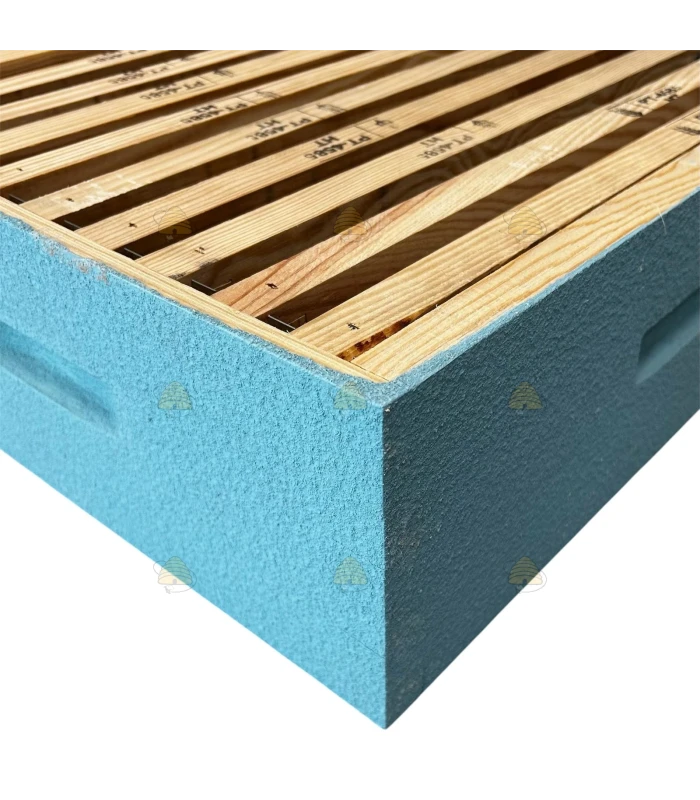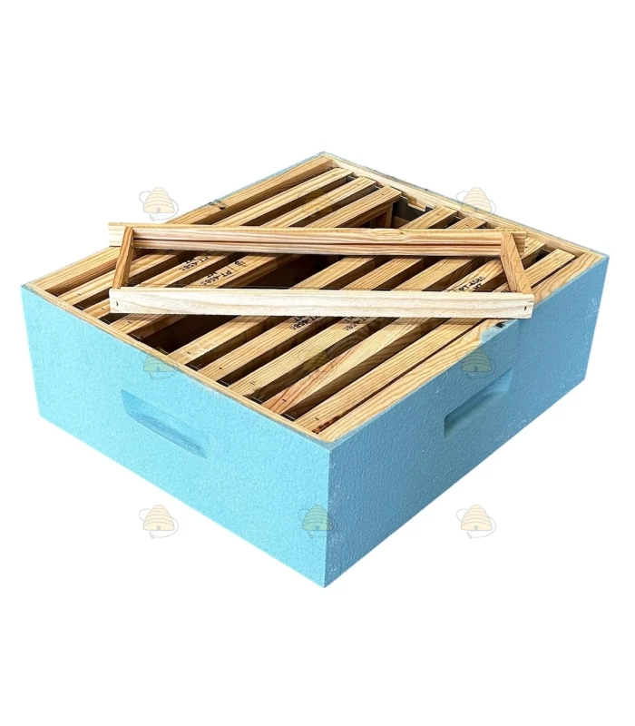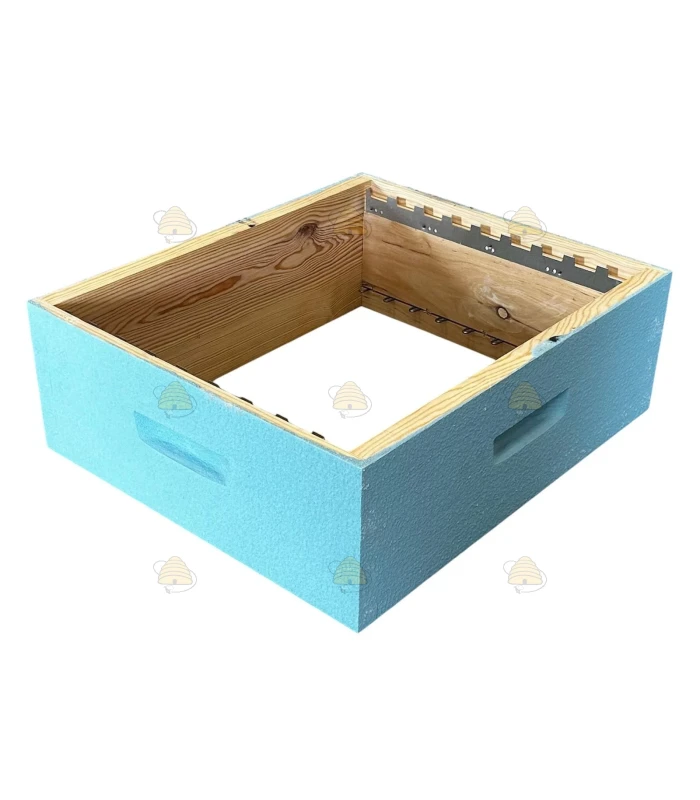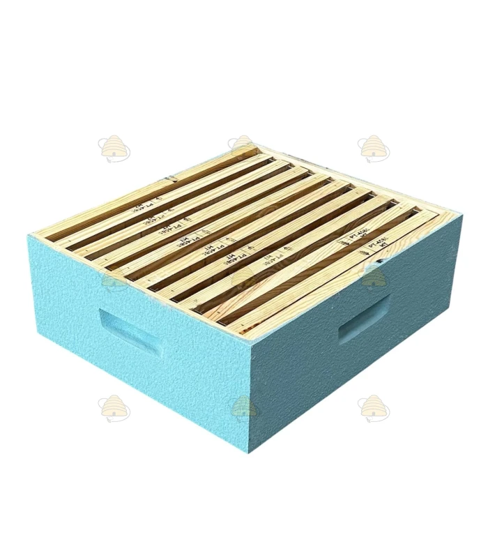 Fertige Dadant Blatt Honigzarge. Dieser Honigraum für die Dadant Blatt Beute ist in der Farbe Aquafarben lackiert und mit 9 Rähmchen mit Nut ausgestattet. Die Rähmchen können selbstverständlich auch ohne Nut verwendet werden.
