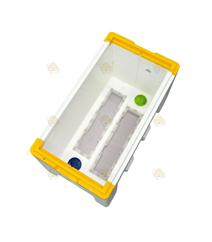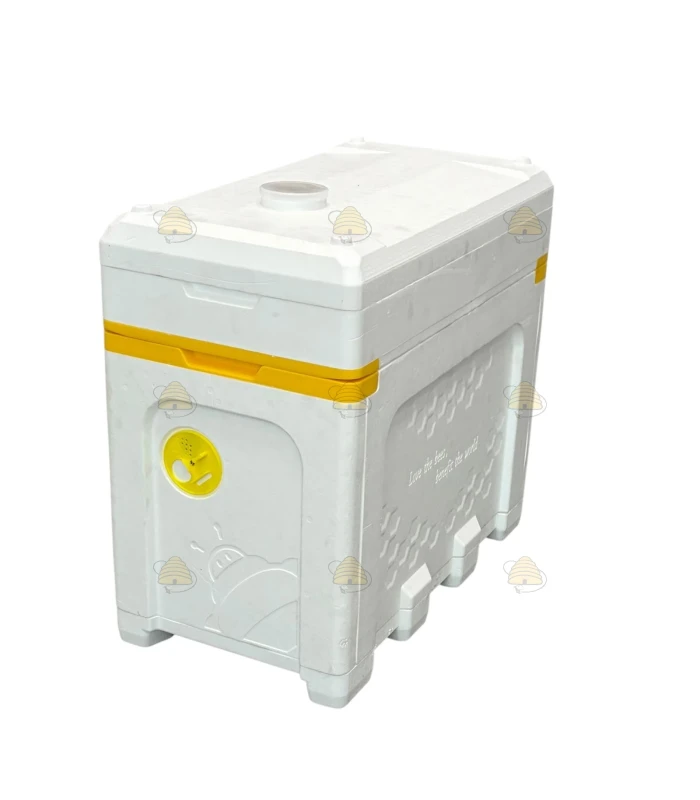 EPS-Ablegerkasten im Dadant Blatt Maß. Sehr stabil, mit Fluglochscheiben auf beiden Seiten und praktischem Futtertrog.