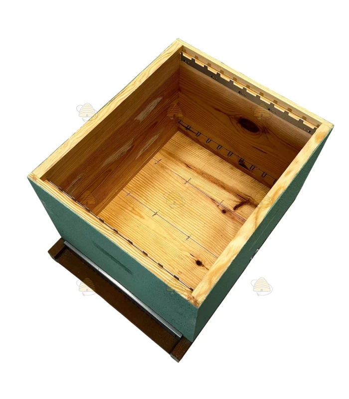 Die Brutzarge ist Meergrün lackiert. Die Rähmchen in der Brutkammer sind mit Nut / Sägeschnitt versehen, können aber selbstverständlich auch ohne Sägeschnitt / Nut verwendet werden. Dank der Abstandshalter und einer Kammleiste, am Boden der Brutkammer bleiben die Rähmchen ordentlich an ihrem Platz. Boden und Ganzzarge sind an den Seiten miteinander verbunden.