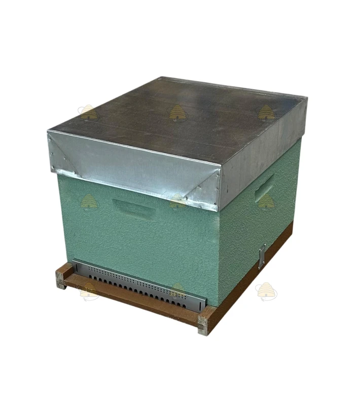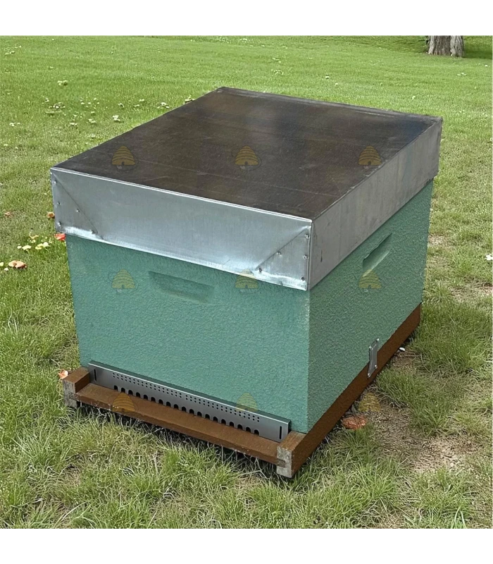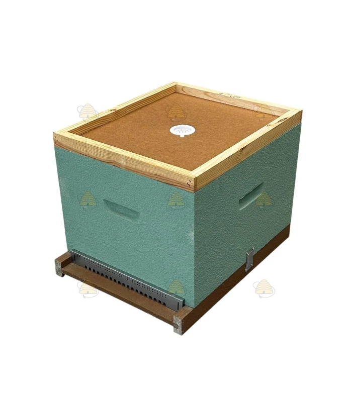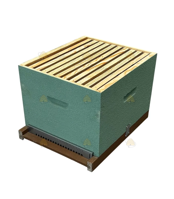Fertige Dadant Blatt Holzbeute aus Kiefer, komplett geliefert und bereits in Meergrün lackiert.