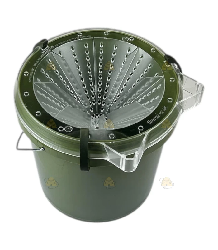 Sehr robuste, große Asiatische Hornissenfalle, geliefert in Transparent mit einem grünen Eimer. Diese Hornissenfalle kann sowohl stehend als auch liegend verwendet werden (dank der Halterungen). Die Falle und der Eimer werden inklusive Klammern geliefert, um die Falle am Eimer zu befestigen. Am Ende der Falle, innerhalb des Eimers, befindet sich ein zusätzliches Röhrchen mit einem Winkel. Dadurch ist es der Asiatischen Hornisse unmöglich zu entkommen.