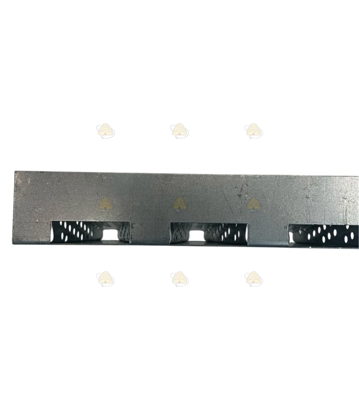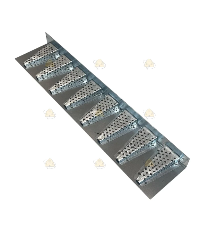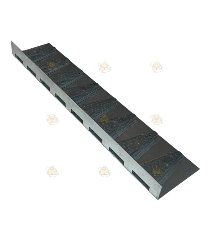 Durch die Montage dieses Trichters vor der Beute kann Räuberei und das Eindringen von Hornissen in das Bienenvolk verhindert werden. Der Schutz kann entweder vor den Kasten geschraubt oder mit einem Spanngurt davor geklemmt werden. Die Länge beträgt 41,5 cm, die Höhe 3 cm und die Breite 8,5 cm. Es kann hilfreich sein, das Anflugbrett etwas zu verbreitern (oder eine etwas breitere Platte unter dem Schutz zu montieren), damit die Bienen mehr Landeplatz haben, bevor sie in den Schutz gelangen.