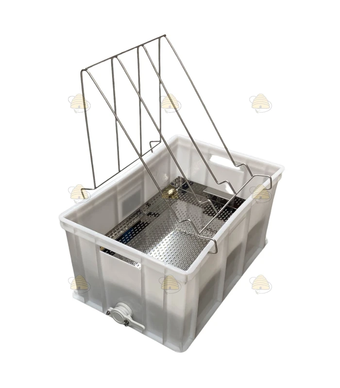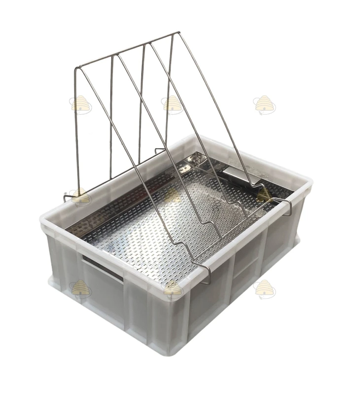 Robustes Entdecklungsgeschirr zur Aufnahme von Honig und Entdecklungswachs beim manuellen Entdeckeln von Rähmchen. Das Set besteht aus einer stabilen Auffangwanne mit Edelstahl-Sieb sowie einem integrierten Rähmchenhalter, der ein sicheres Auflegen der Rähmchen während der Arbeit ermöglicht.