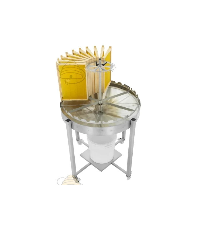 Dieser hochwertige Entdeckelungstisch eignet sich ideal für die Verarbeitung von entdeckelten Rähmchen. Der Tisch ist drehbar und bietet Platz für bis zu 30 Rähmchen. Hergestellt aus lebensmittelechtem, hochwertigem Edelstahl, ist er leicht zu reinigen und an der Unterseite mit einem Quetschhahn ausgestattet.