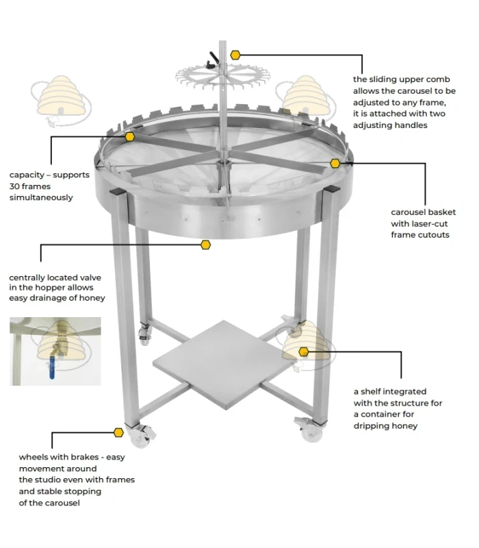 Der obere Teil des Tisches ist verstellbar, sodass er für jede Art von Rähmchen geeignet ist. Stellen Sie einfach einen Eimer auf das untere Plateau, und der ausgeschleuderte Honig fließt mühelos durch den Hahn hinein. Die Rollen des Tisches lassen sich bei Bedarf arretieren.