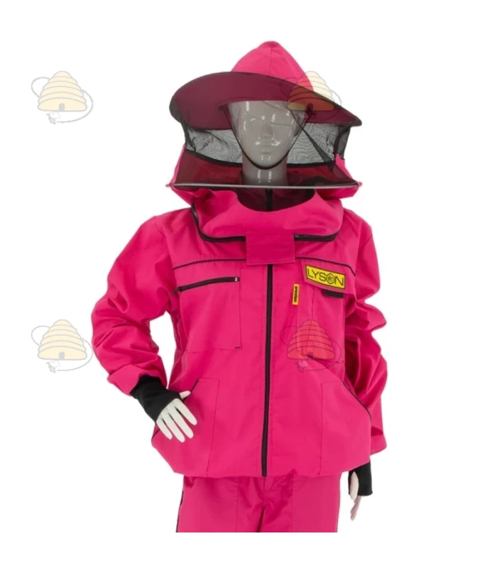 Farbenfrohe Imkerjacke der Marke Lyson. Das Jacke ist pink und verfügt über eine runden Hut, sowie Ärmelabschlüsse mit Bündchen für optimalen Schutz. Hergestellt aus atmungsaktivem Material, bietet diese langlebige Imkerjacke hohen Tragekomfort und schützt zuverlässig bei der Arbeit am Bienenstock.