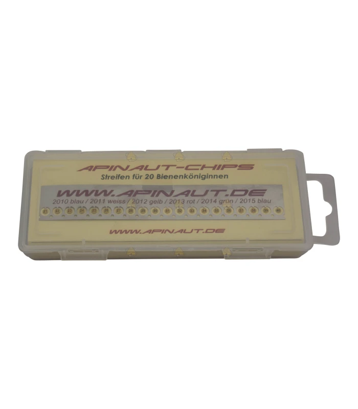 Apinaut Königinnenzeichen Chips in der Farbe gelb. Die Chips bestehen aus 0,1 mm starkem Spezialstahl und werden mit Opalith-Zeichenleim auf der Königin angebracht. Sie können bequem selbst die gewünschte Nummernserie (1 - 20, 21 - 40, 41 - 60) auswählen.