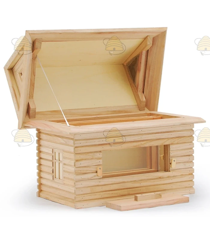 Die Beute verfügt über ein Sichtfenster mit Glasscheibe, das sich mithilfe einer Holzplatte öffnen und schließen lässt.
