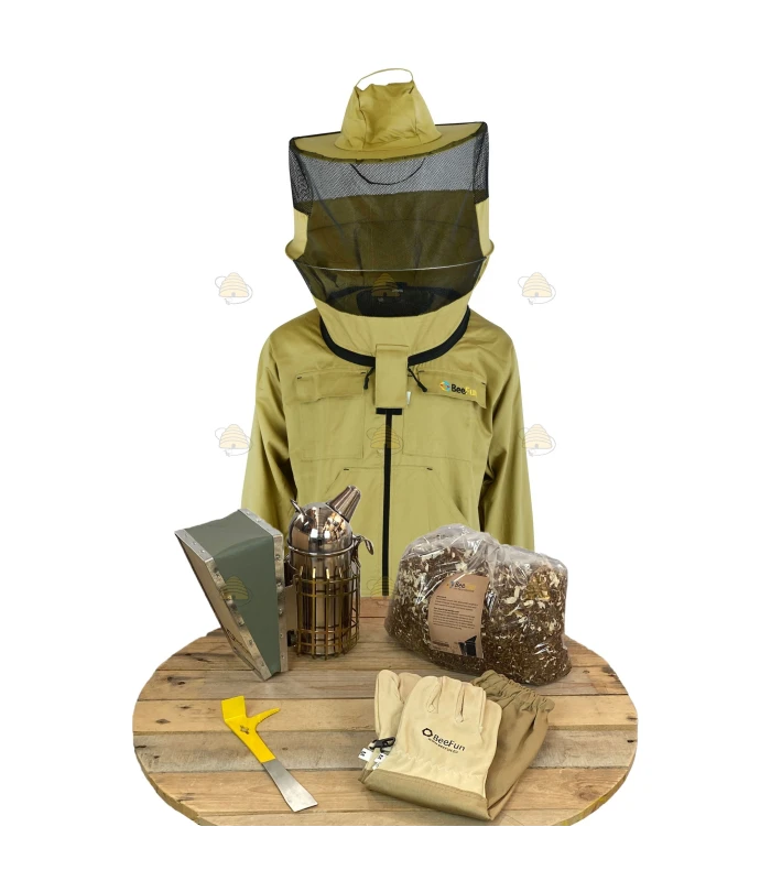 Das Starterset Imkerei enthält alle wichtigen Grundausstattungen, die Sie zum Imkern benötigen. Dieses Set besteht aus einer kaki Imker*innenjacke, kaki Imker*innenhandschuhen, einem Smoker, Rauchtabak und einem Stockmeißel. Damit sind Sie bestens ausgerüstet, um direkt mit der Arbeit an Ihrem Bienenvolk zu beginnen.