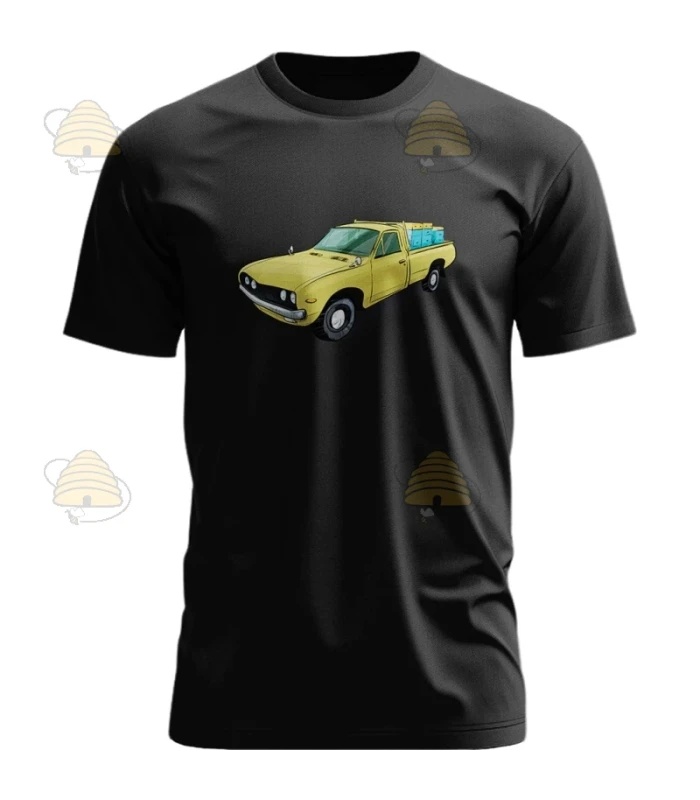 T-Shirt mit Illustration eines klassischen japanischen Pick-ups, ausgestattet mit Bienenstöcken auf der Ladefläche.