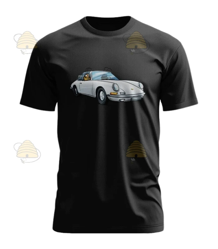 Original-T-Shirt mit Illustration eines weißen Porsche mit einer Biene am Steuer!
