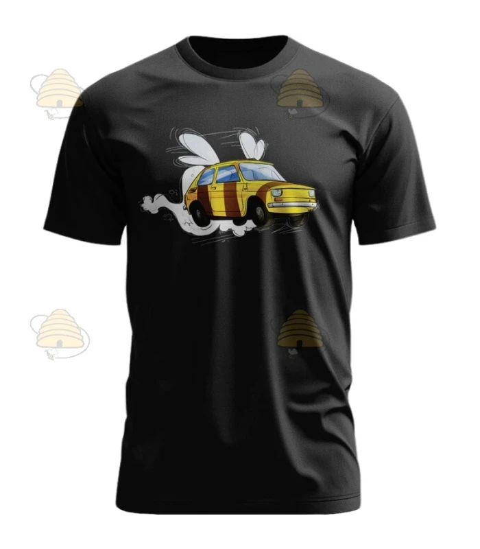 Schwarzes Original-T-Shirt mit Illustration eines fliegenden Fiat 126P und Streifen!