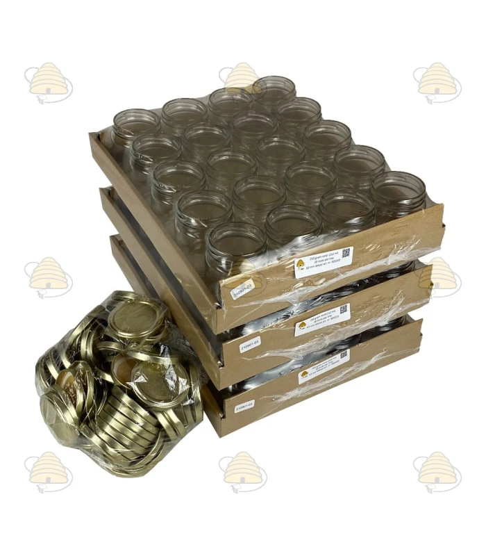 Perfekt geeignet zum Abfüllen und Aufbewahren von Honig. Die Honiggläser sind zu 20 Stück in einer Tray-Verpackung erhältlich – inklusive goldfarbener Twist-Off (TO) Deckel 63 mm, die luftdicht verschließen und den Inhalt lange haltbar halten. Durch das klare, hochwertige Glas kommen die natürliche Farbe und Konsistenz des Honigs besonders schön zur Geltung – ideal für eine ansprechende Präsentation und den Verkauf von Honig.