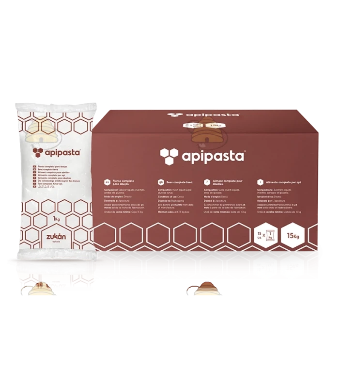 Zuckerteig der Marke Apipasta, verpackt zu 1 kg. Apipasta besteht hauptsächlich aus Saccharose, wodurch er für Bienen besonders attraktiv ist und von Imkern leicht verwendet werden kann. Der Teig besteht aus Mikrokristallen, von denen jedes mit einer Schicht Glukosesirup überzogen ist. Speziell so entwickelt, dass er von den Bienen leicht aufgenommen werden kann.